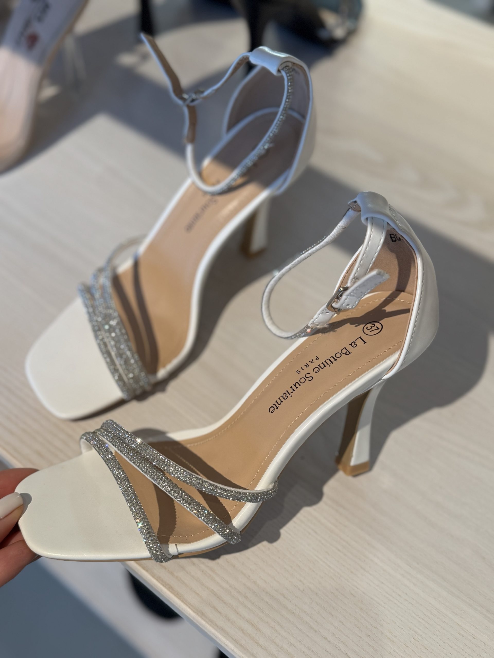 Eco leather sandals with shiny straps. Heel height: 9cm