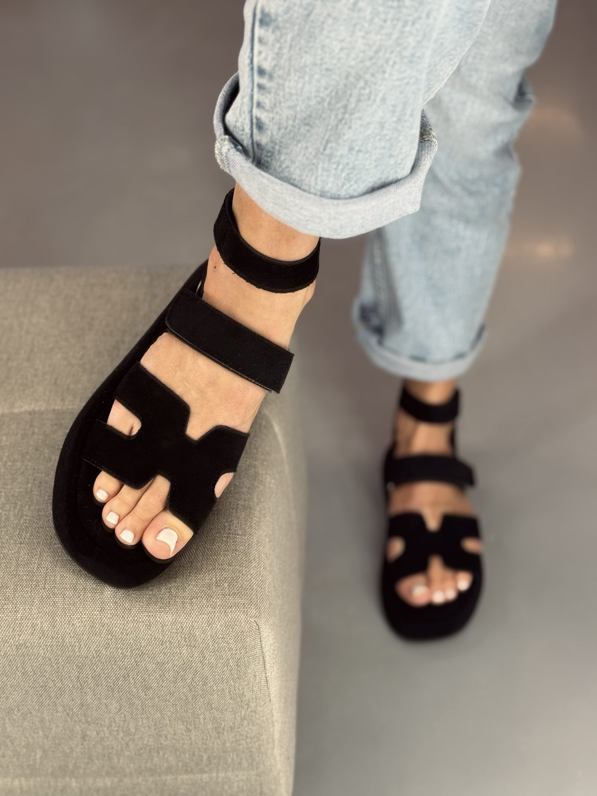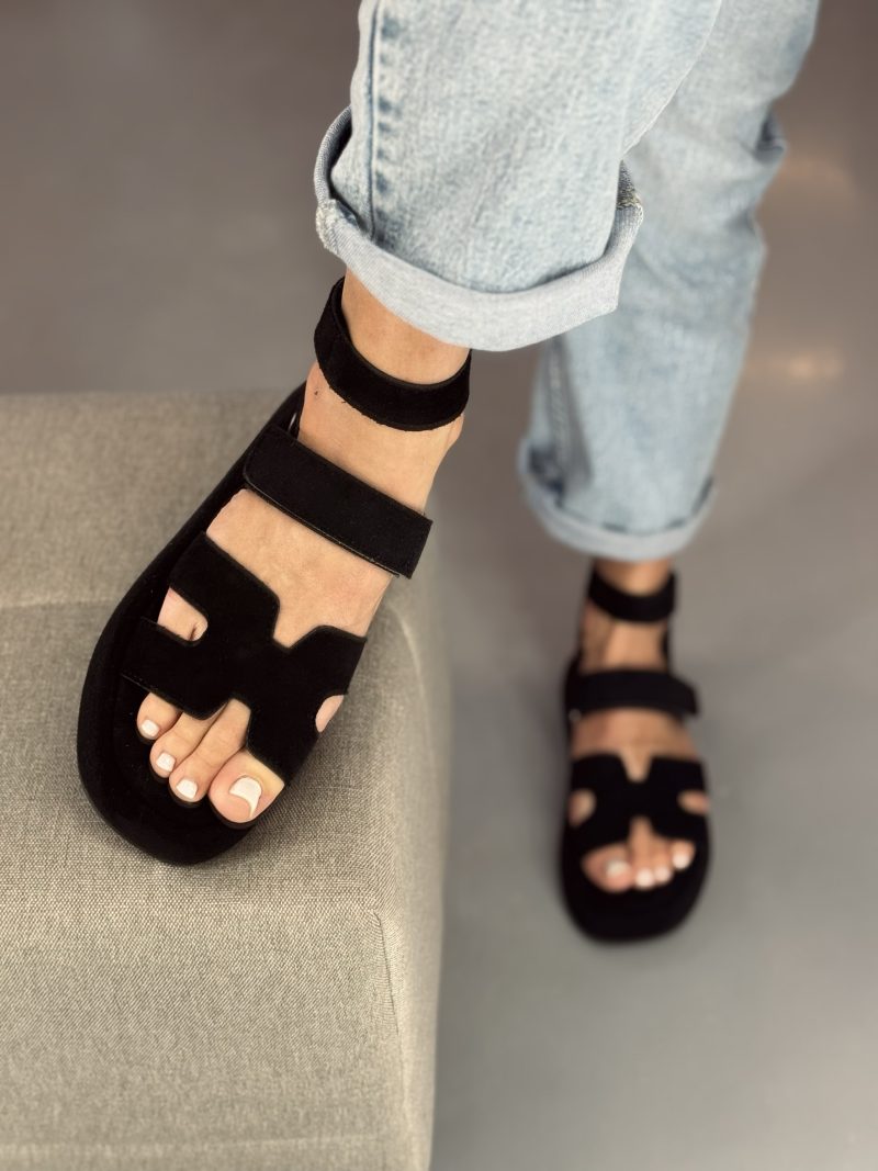 Eco suede leather sandals, adjustable with velcro straps. Non-slip sole.