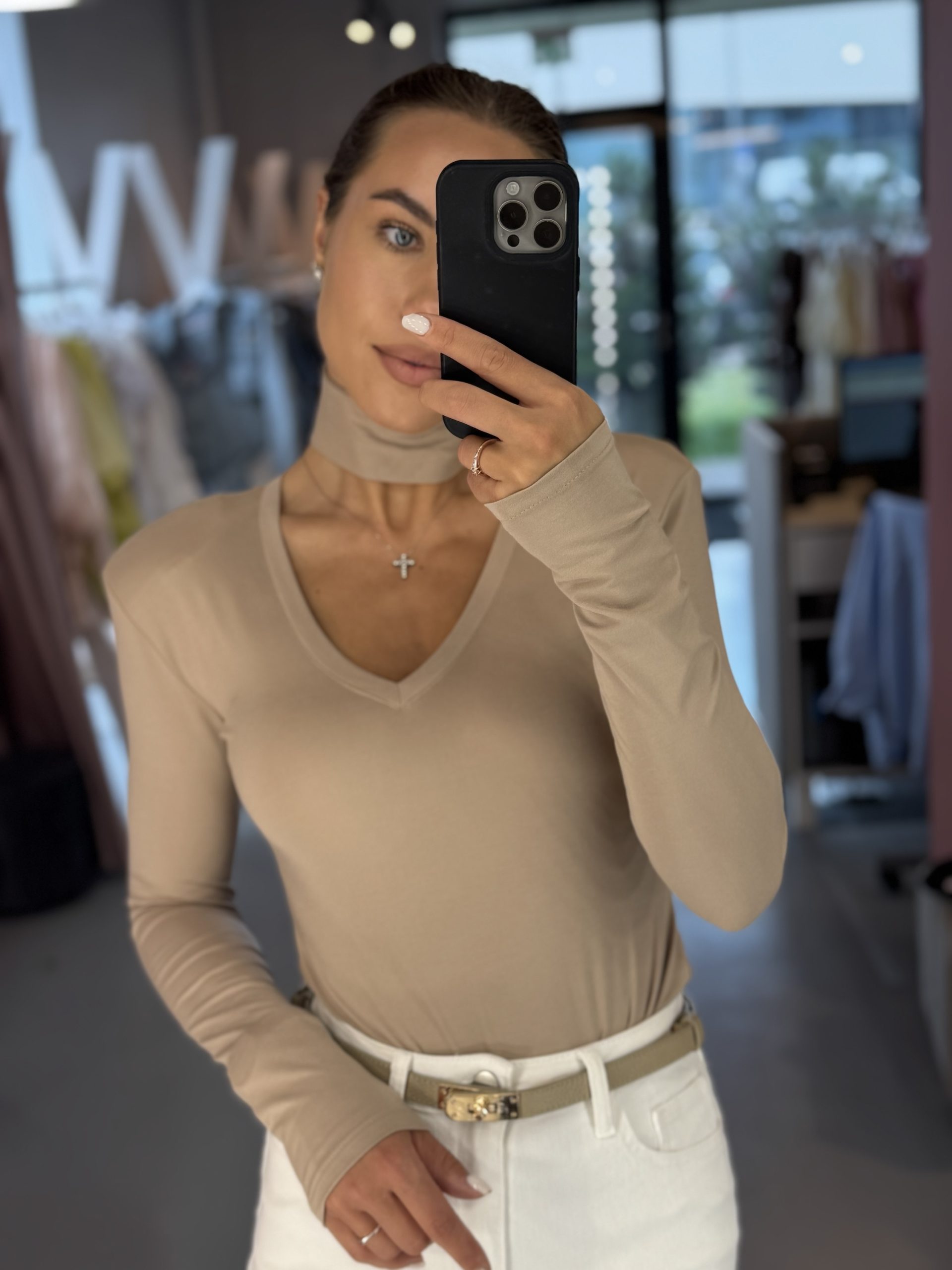 Made of a fabric that is pleasant to the touch and comfortable to wear. Shoulder pads. Tailored haircut. V-neckline. An additional neck strap can be removed.