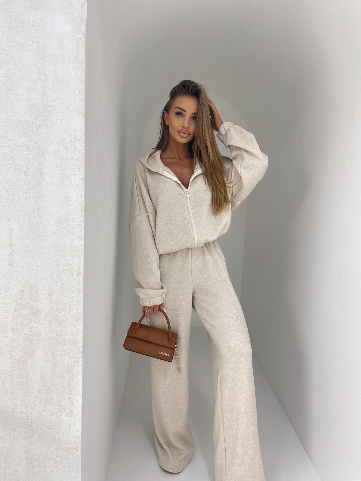 Knitted jumper + trouser set. Jumper with zip. Wide leg cut. Elasticated waist.