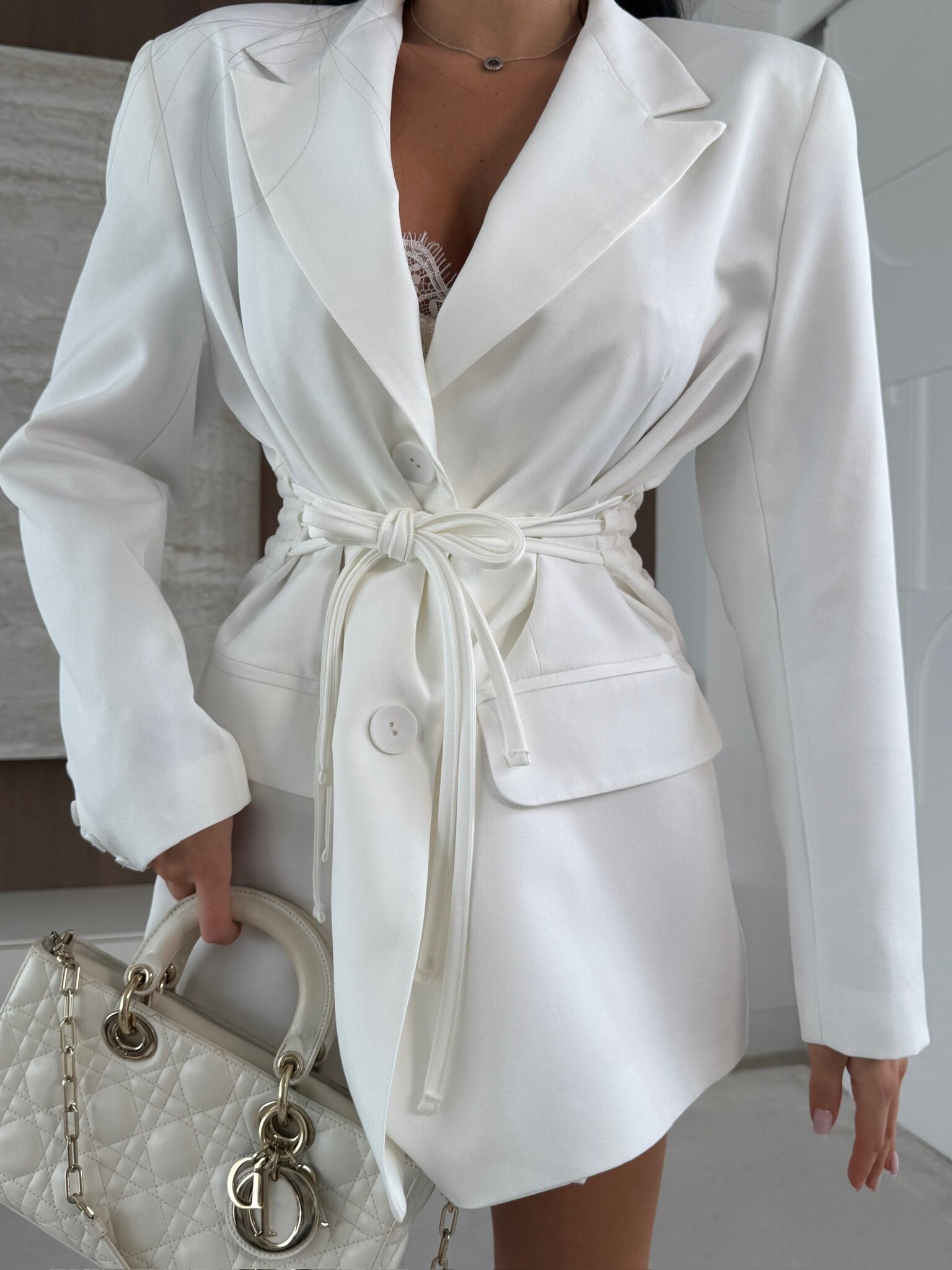 Made with attention to detail, shoulder pads. Adjustable button closure. Drawstrings at the sides to define the waist.