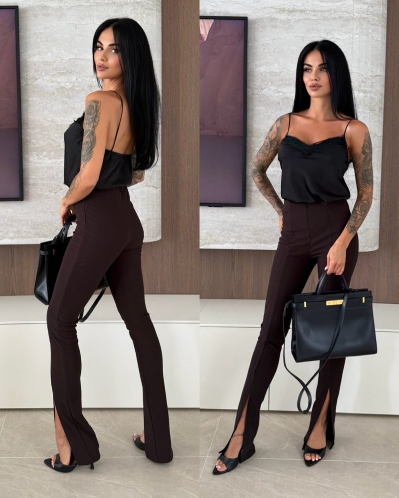 The trousers have a fitted silhouette and wider legs with slits. The fit is perfect, giving you complete freedom of movement. The high waist shapes the waist.