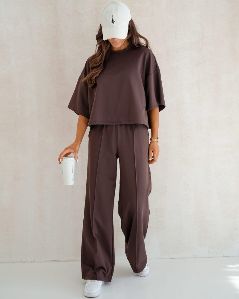 Shorter blouse and high-waisted trousers with pockets. Elasticated material