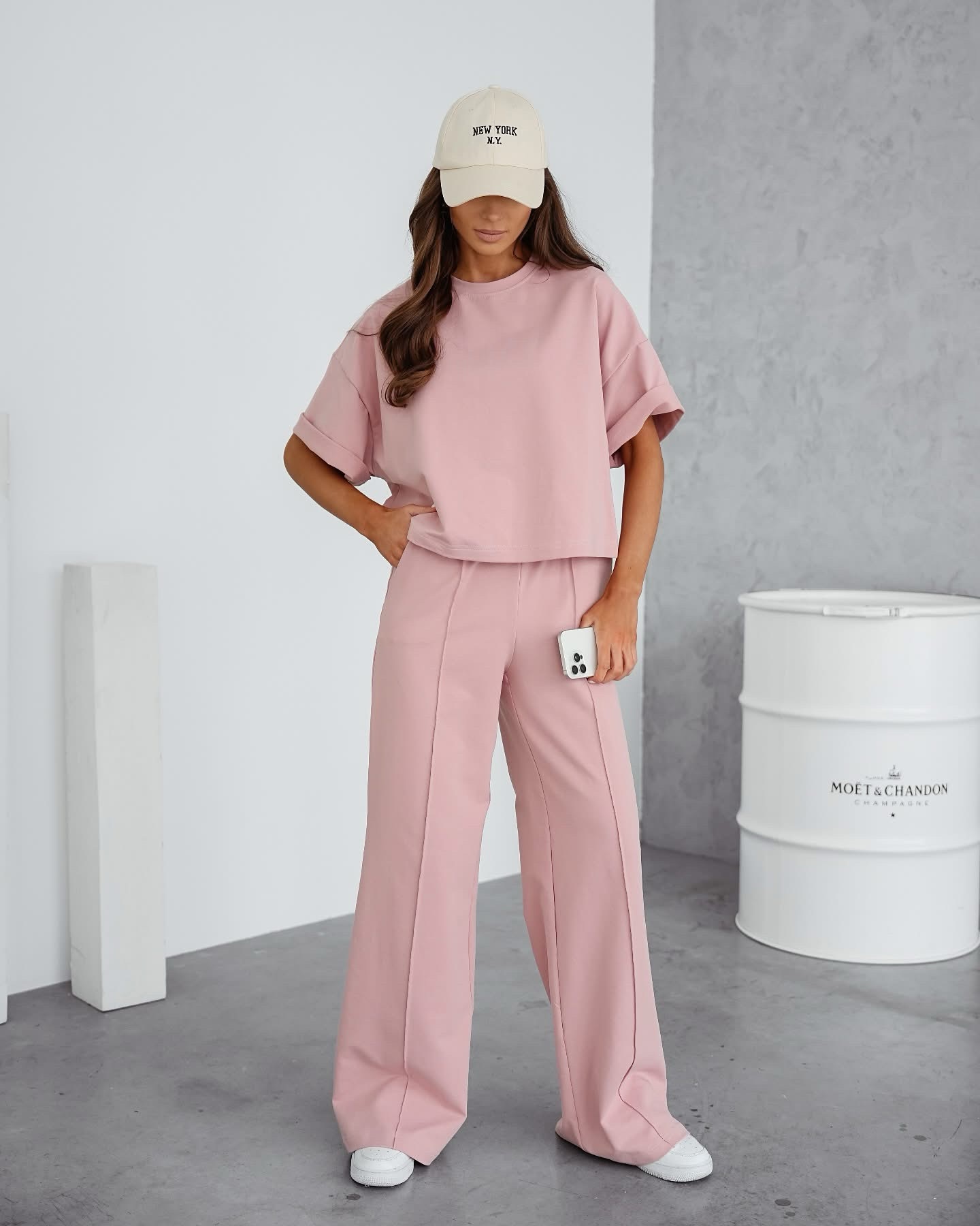Shorter blouse and high-waisted trousers with pockets. Elasticated material