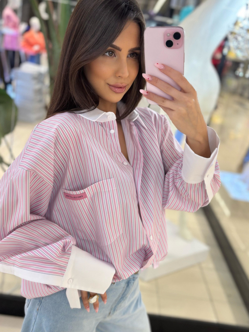 Elegant shirt with blue stripes, white cuffs and a beautiful finish. A stylish accent in the form of a red spot on the pocket adds a unique touch.