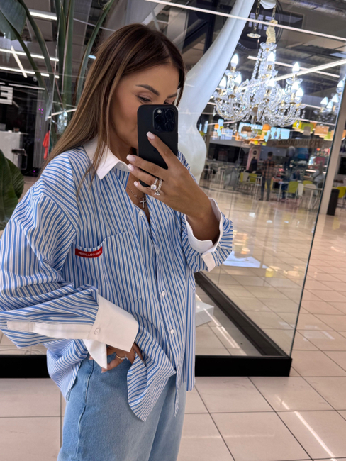 Elegant shirt with blue stripes, white cuffs and a beautiful finish. A stylish accent in the form of a red spot on the pocket adds a unique touch.