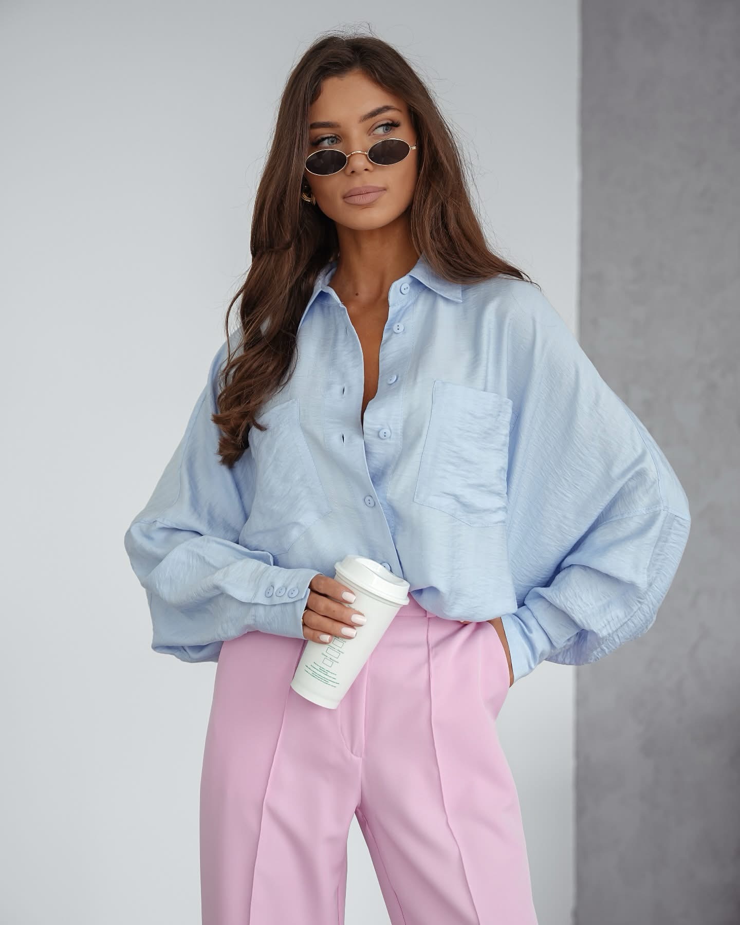 Elegant oversized T-shirt. Two front pockets, button fastening.