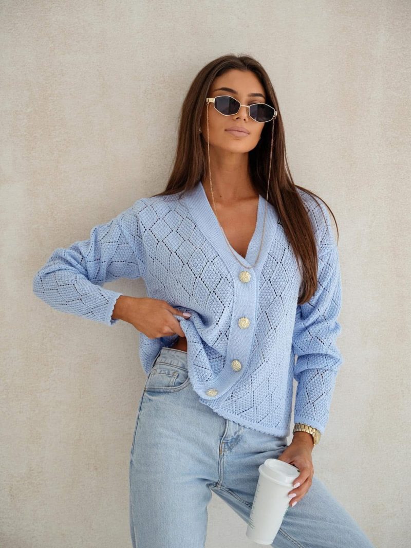 Sweater with gorgeous buttons, made in Poland for warm weather wear.