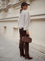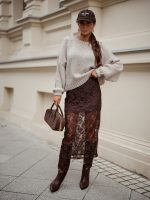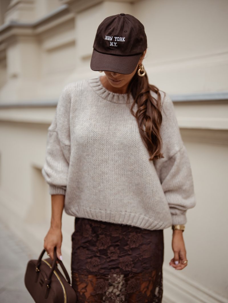 Wider jumper with elastic at the back, nice fit. Lightweight, so it will be comfortable for everyday combinations.