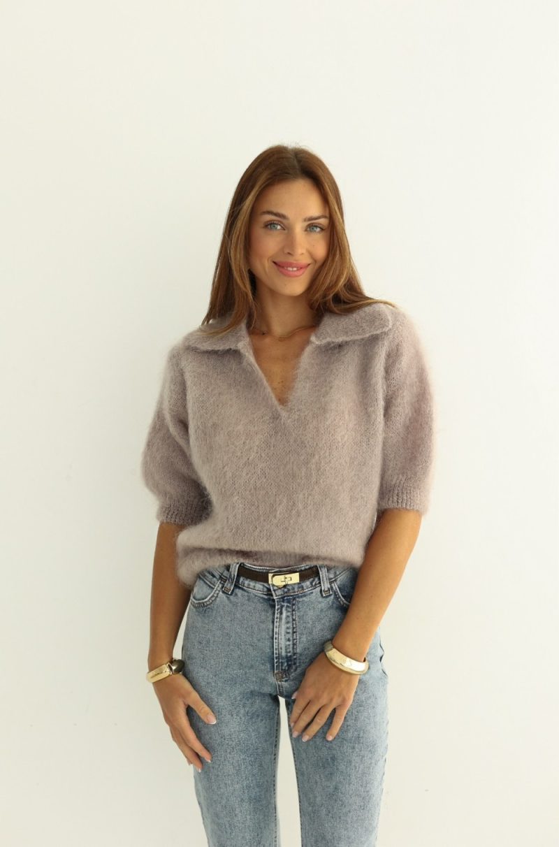 Loose-fit beige polo jumper. We’re sure it will help you create many fantastic looks! This slightly larger, short-sleeved model is made of soft, durable material. It’s a great idea to team this ladies’ sweater with high-waisted trousers and high-heeled shoes.