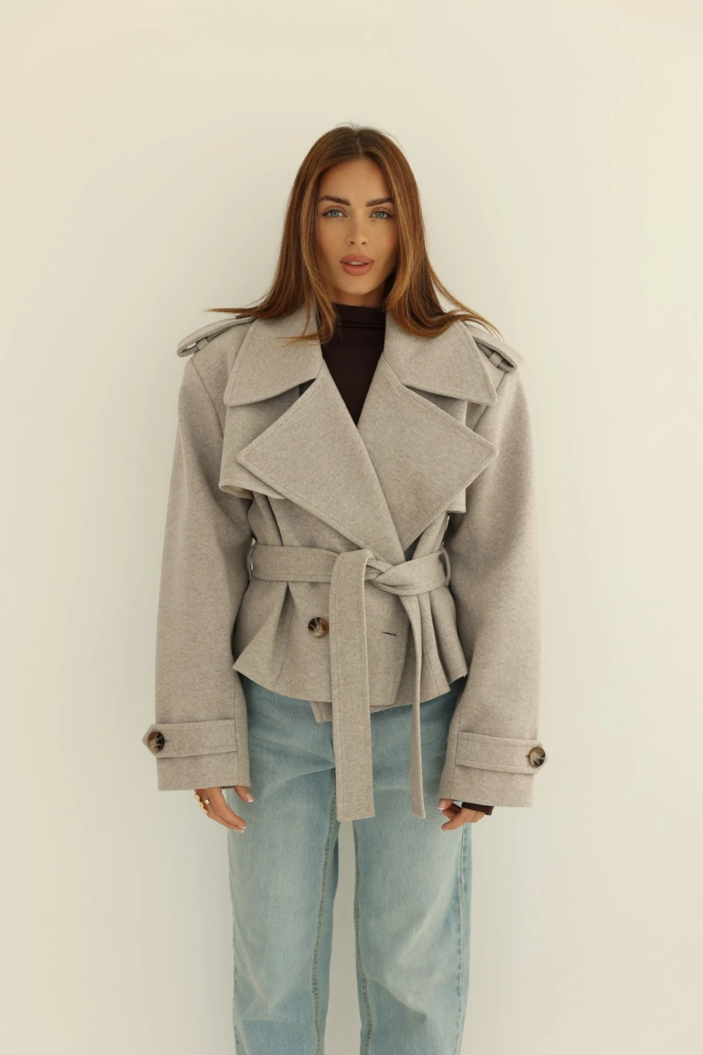 Made of soft fabric. Adjustable strap. Attention to detail, including shoulder straps. Jacket with lining and belt.