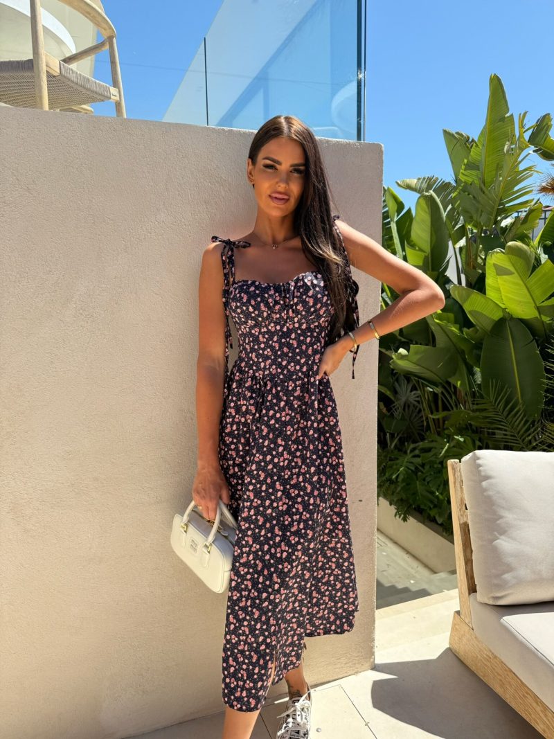 Midi length, floral pattern. Feminine cut. The dress has cups to support the bust. Length adjustable with drawstrings.