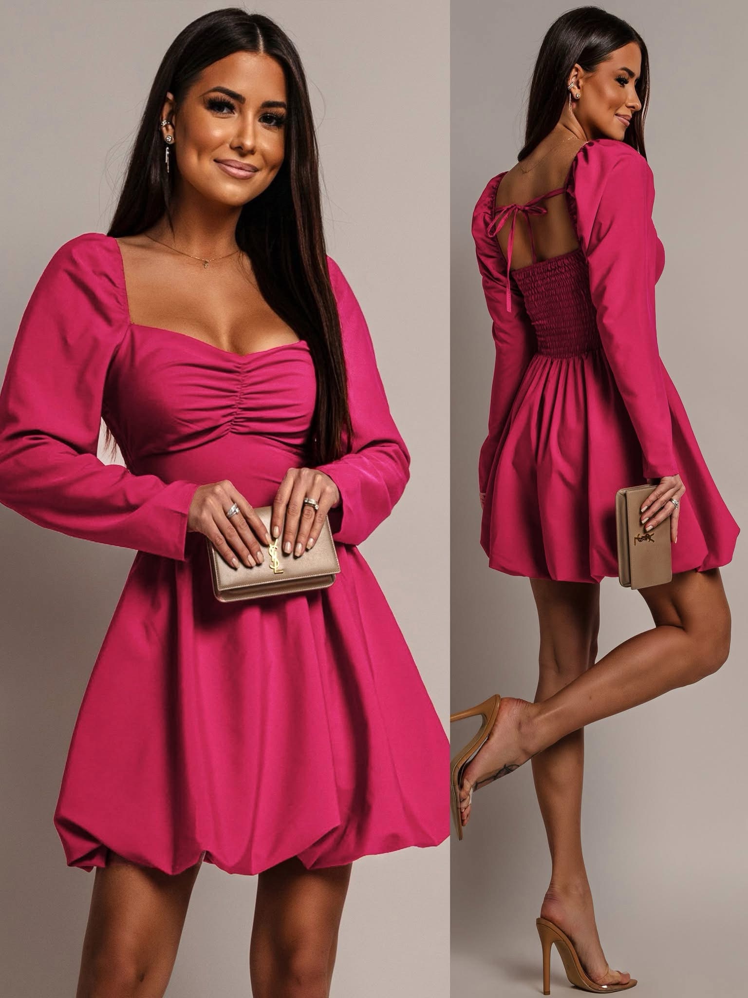 Mini-length dress in stretch fabric. Chest area with packets, elasticated rubber band at the back. Beautifully lined.