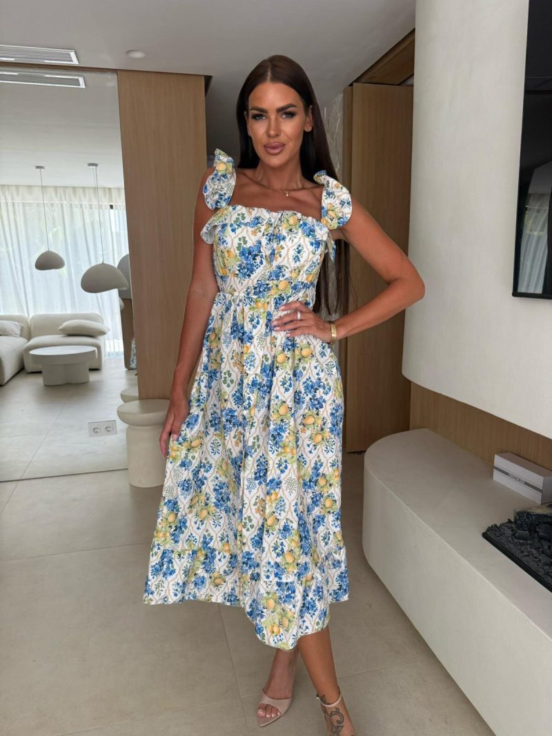 Fashionable pattern, very feminine cut. The dress has stiffer scoops.