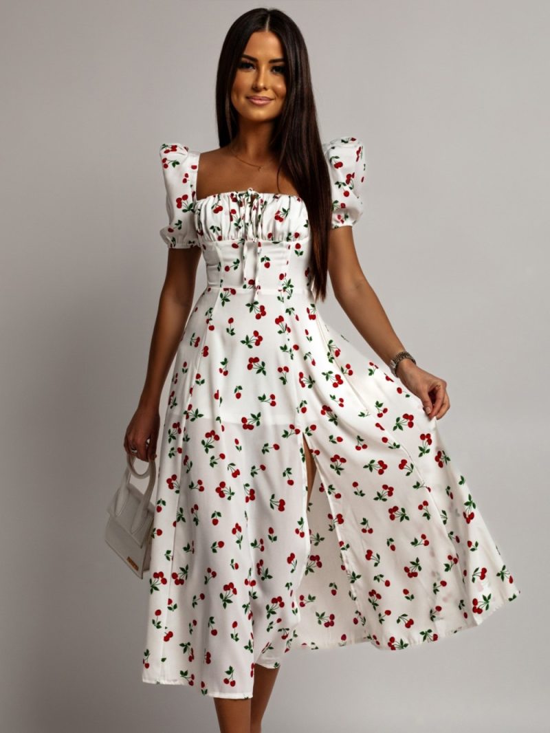 Stylish dress in classic white with short, puffed sleeves. Made of delicate material and decorated with a trendy cherry pattern.