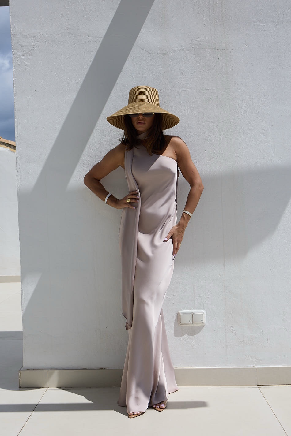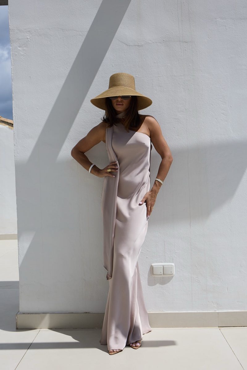 Maxi-length dress with a ribbon at the neck. Slightly flared at the hips.