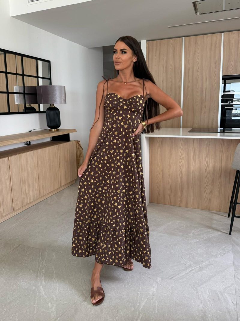 Lace decoration, feminine cut. Exposed neckline and back. Bold waist. Adjustable length with shoulder straps. Dress with cups and lining.