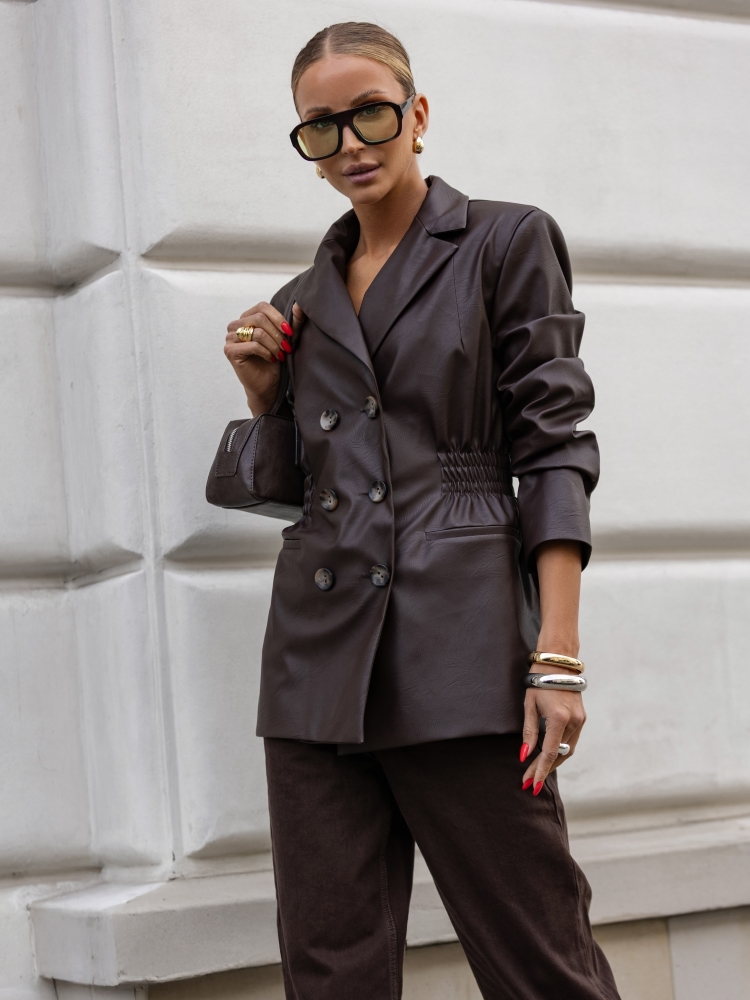 The exceptionally elegant Benna jacket has a longer cut. The lining and shoulder pads ensure a perfect fit. The front is decorated with tasteful double buttons. In addition, the waistband with drawstrings gives a slimmer silhouette.